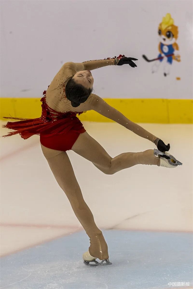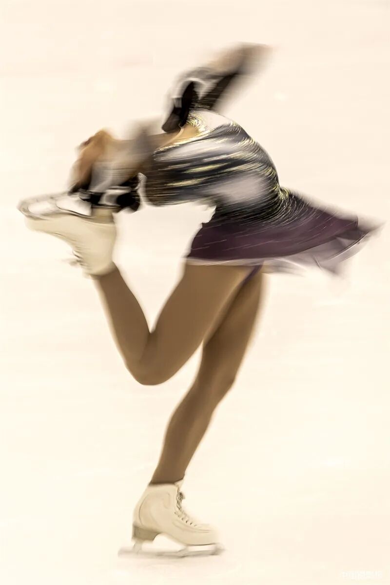 一般选用70-200mm镜头较为适用,为突出运动员主体,建议用浅景深。设置光圈F2.8,白平衡自动,ISO数值根据室内灯光强弱设置,一般在ISO1600以上,高速连拍模式,RAW格式拍摄。为把冰面拍得白一些,曝光需要加1挡。对焦点设定可以是组对焦或者单点对焦。由于滑冰场地四周都有护栏,为避免护栏和现场工作人员对画面背景的干扰,拍摄机位最好选在裁判组对面的观众看台的中等高度的位置拍摄。这个高度可以保持画面背景干净,拍出来的运动员形体比例也适中,同时也可以把运动员唯美的姿态和赛事的LOGO完整拍到画面中。